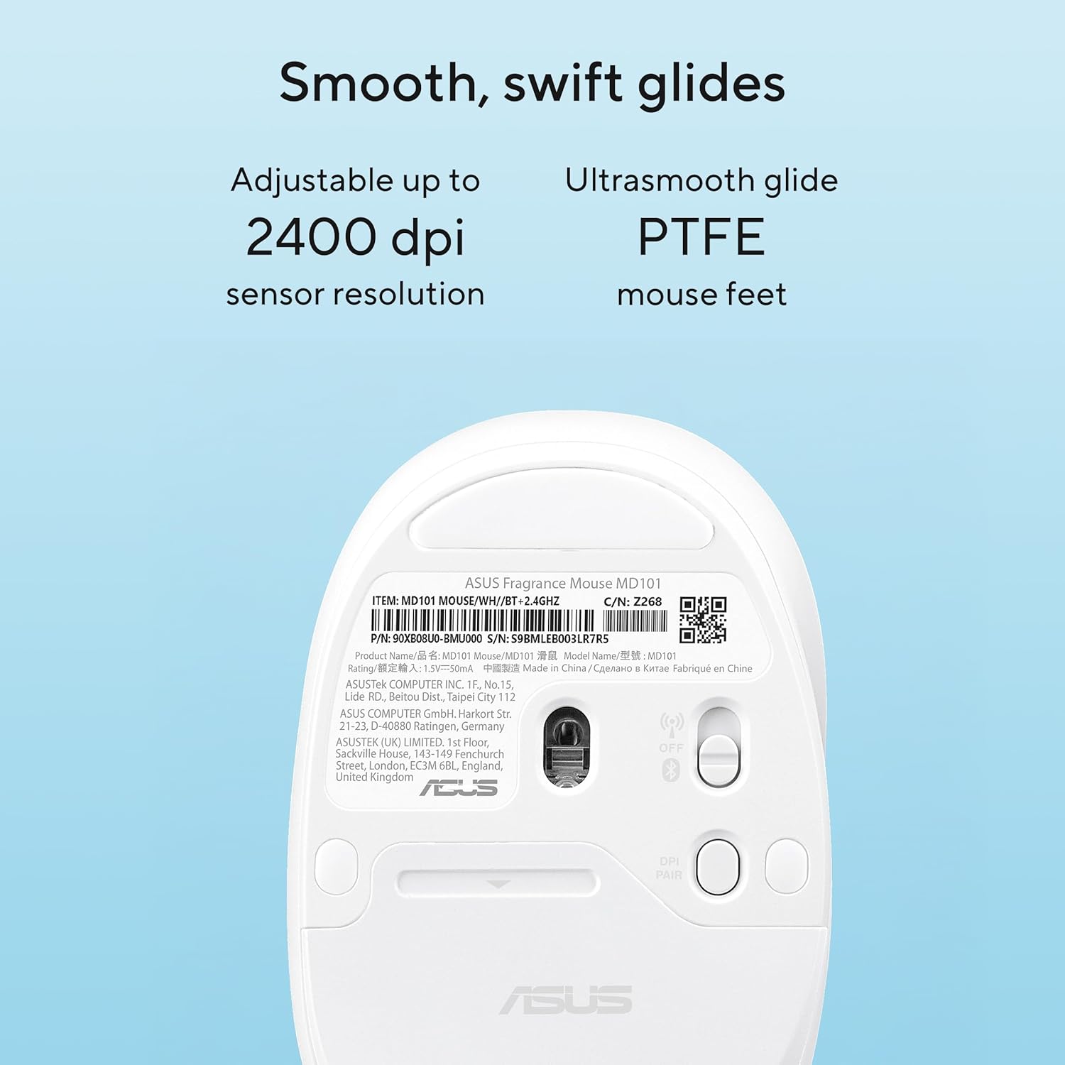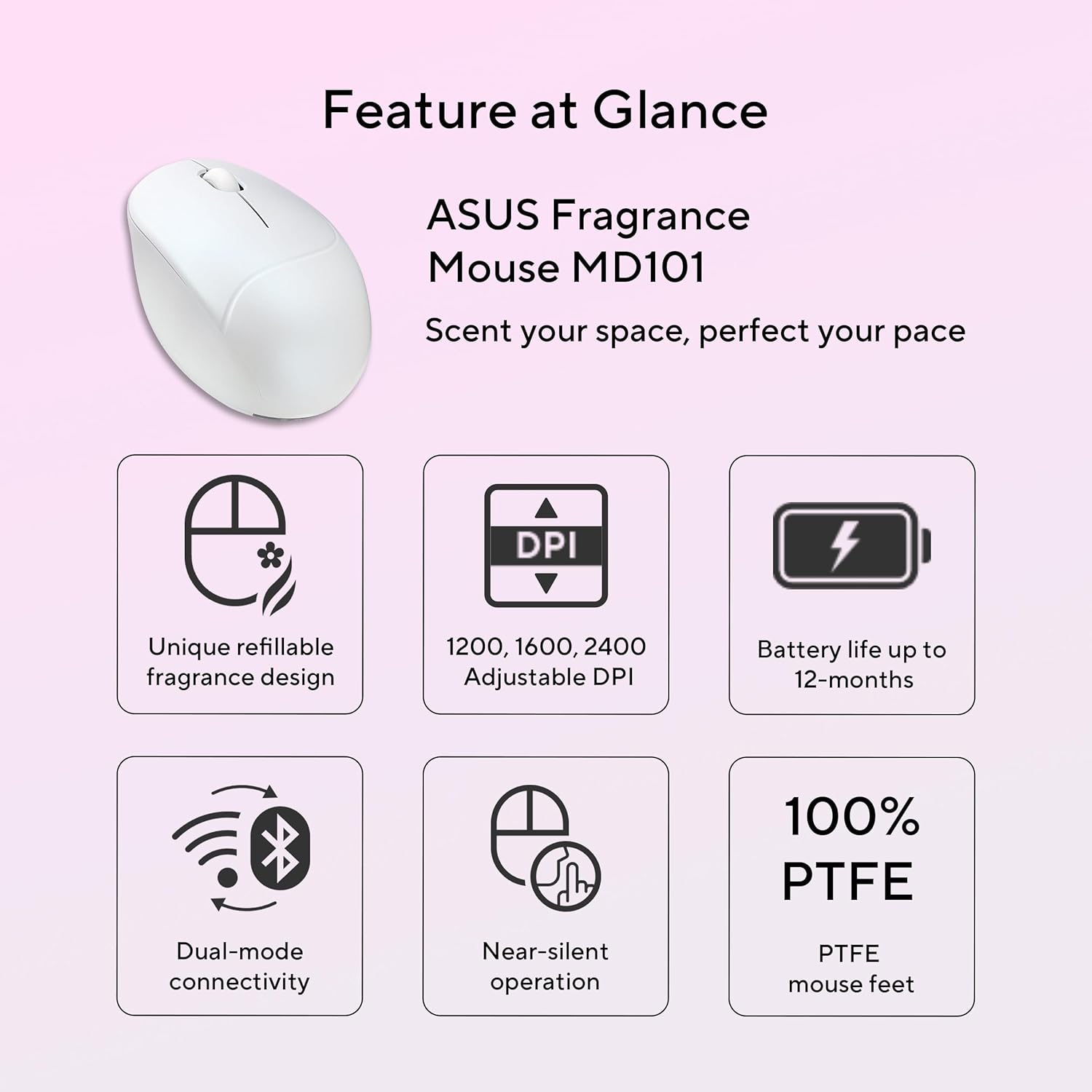 ASUS MD101 Silent Fragrance Mouse, Upto 2400 DPI, Pair Up to 2 Device, Ergonomic Wireless Right Handed Optical Mouse with Bluetooth (2.4GHz Wireless, Bluetooth, Iridescent White)